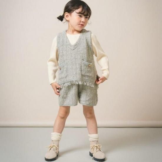 まるで本格ツイードのような立体感とあたたかみ。フリンジの裾やゴールドボタン付きポケットが上品なアクセントになった、ツイード風ニットベストです。同素材のショートパンツとセットアップがおすすめ!きちんと感があるので、お呼ばれや特別なお出かけにもぴったり。もちろん洗濯機洗いOKで、お手入れも簡単です。