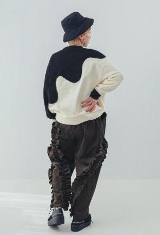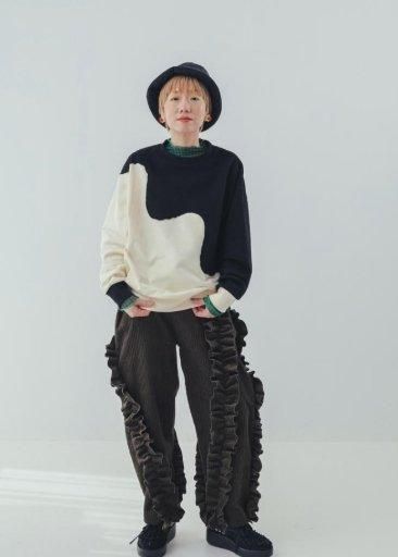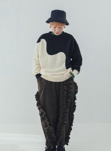 夜の帳(とばり)が次第に降りていくような、とろりとしたウェーブによる色の切り替えが大胆なトレーナーです。柔らかく伸縮性の良い生地は、男の子にも気軽に着ていただけるカジュアルさ。 袖口の配色の違いもポイントです。