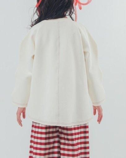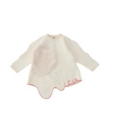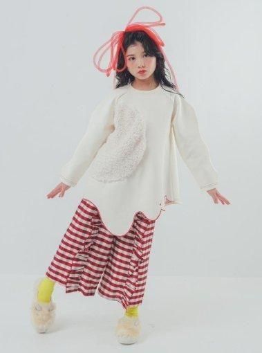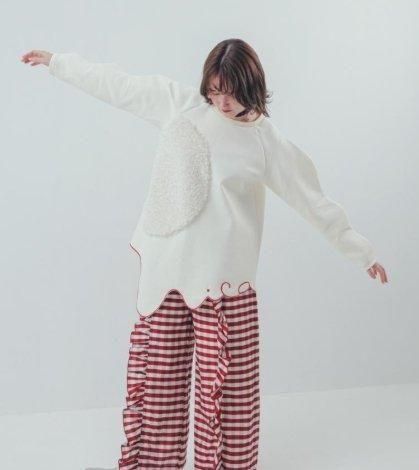 前面に大きくデザインされた半円はふかふかのボア素材で、見た目にもあたたかでユニークなカッティングの裾には、よく見るとブランドネームの刺繍が。波のようにうねった袖など、随所にひねりを効かせたトップスです。