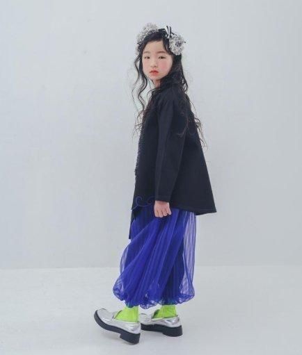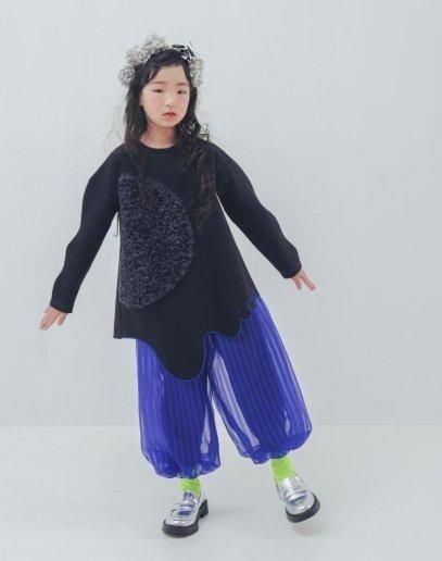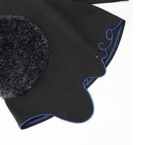 前面に大きくデザインされた半円はふかふかのボア素材で、見た目にもあたたかでユニークなカッティングの裾には、よく見るとブランドネームの刺繍が。波のようにうねった袖など、随所にひねりを効かせたトップスです。