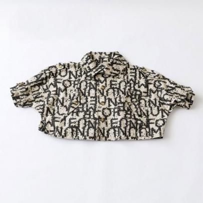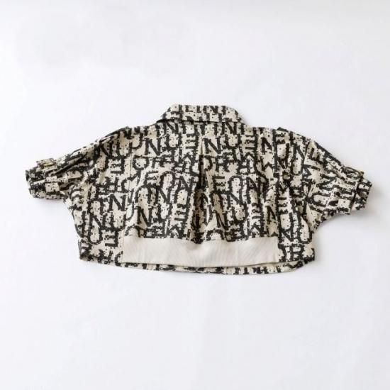 「NUNUFORME」の文字にノイズを入れたプリント生地にジャケット。全体的にワイドで若干ドルマン気味のシルエット。袖口部分が広いので袖ベルトで絞ってギャザーを寄せるデザインです。同柄のパンツ、スカートとセットアップになります。